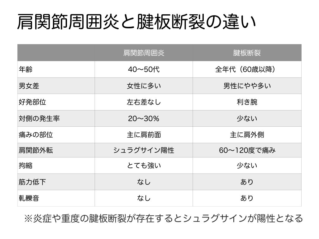 最も誤診されやすいのは腱板損傷ですが、五十肩の初期では拘縮がないことや炎症も軽度であることから、鑑別が難しいことも多いです。