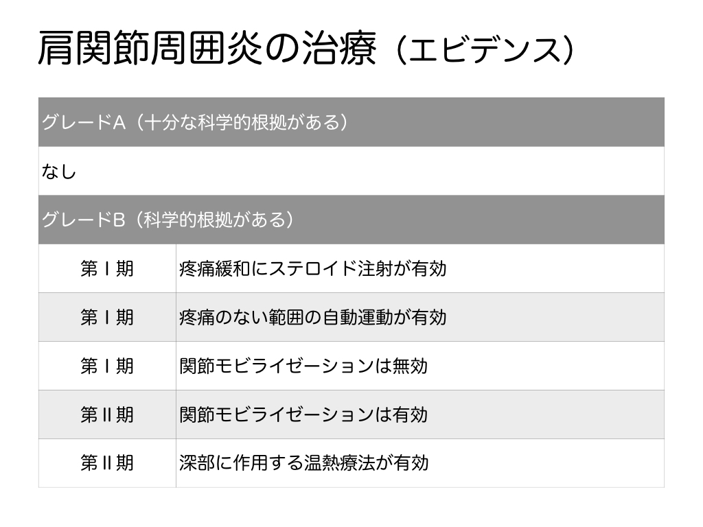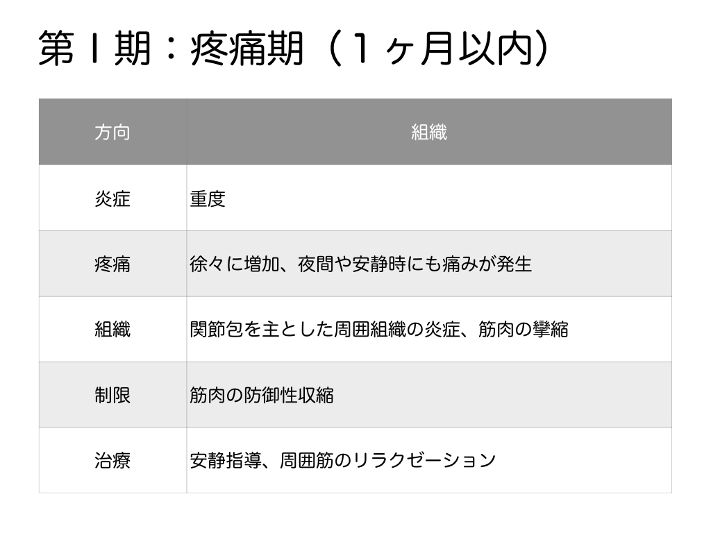 この時期はまだ痛みが強いケースも多いので、関節周囲で攣縮している筋肉のリラクゼーションや温熱療法を中心に行うようにしても構いません。