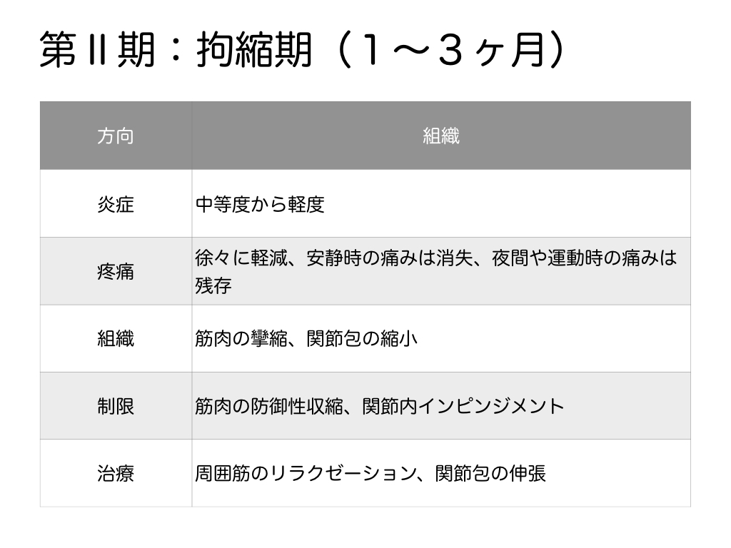 第2段階は「拘縮期」といい、炎症のピークは過ぎているもののまだ残っており、徐々に炎症している組織(関節包)が縮小していく時期になります。