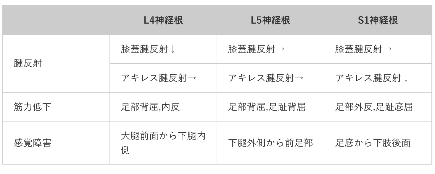基本的に後方へ飛び出したヘルニアが圧迫するのは前根であり、そのレベルに応じた筋力低下(運動障害)を引き起こします。