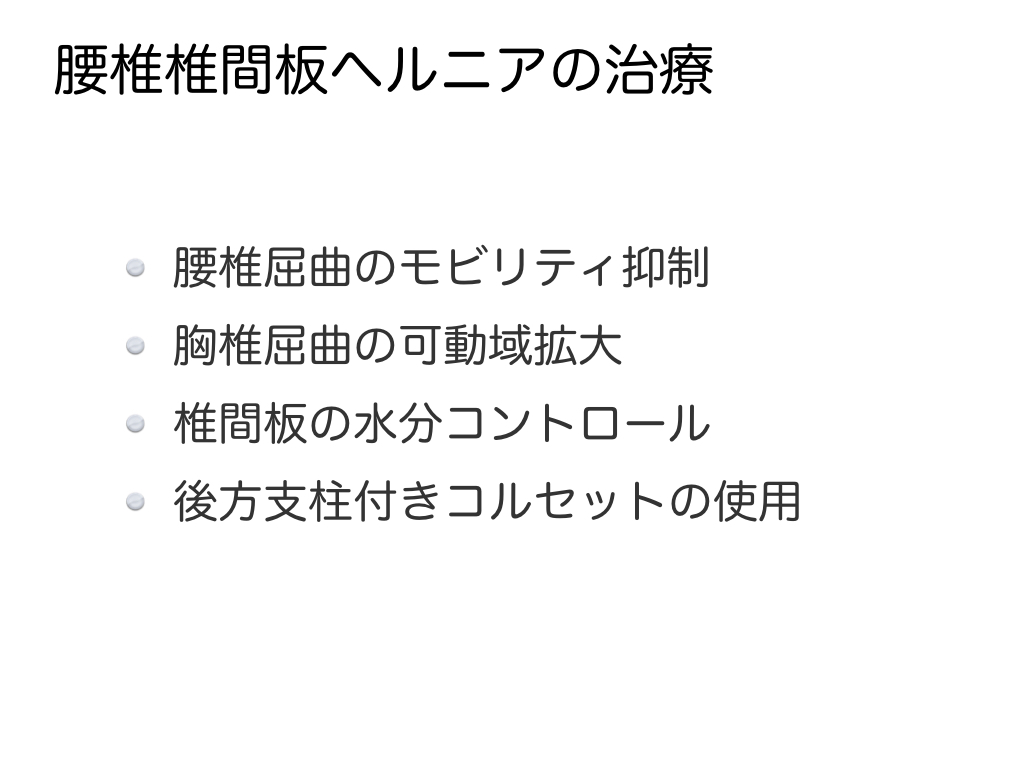また、椎間板ヘルニアを引き起こすことになった不良姿勢の修正や、スポーツ習慣のある患者では動き方の指導などを必要に応じて実施してください。