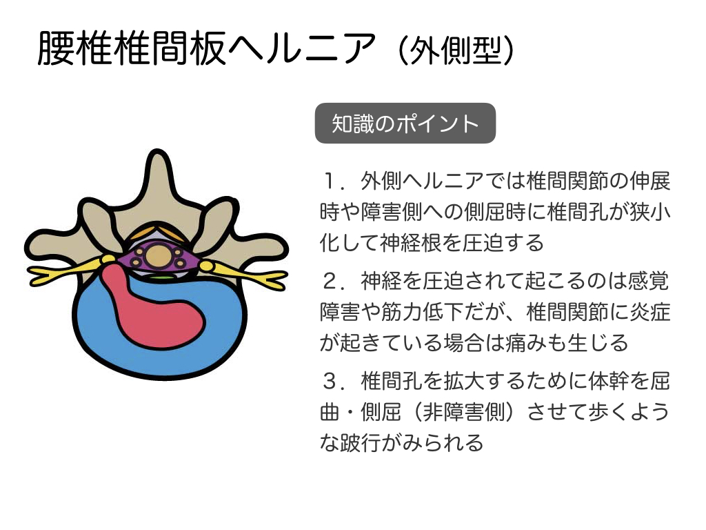 次いで、椎間孔内で神経根を圧迫する外側型がありますが、こちらはL4/5間に発生している場合は、L4神経を圧迫することになり、L4レベルの神経症状を確認する必要があります。