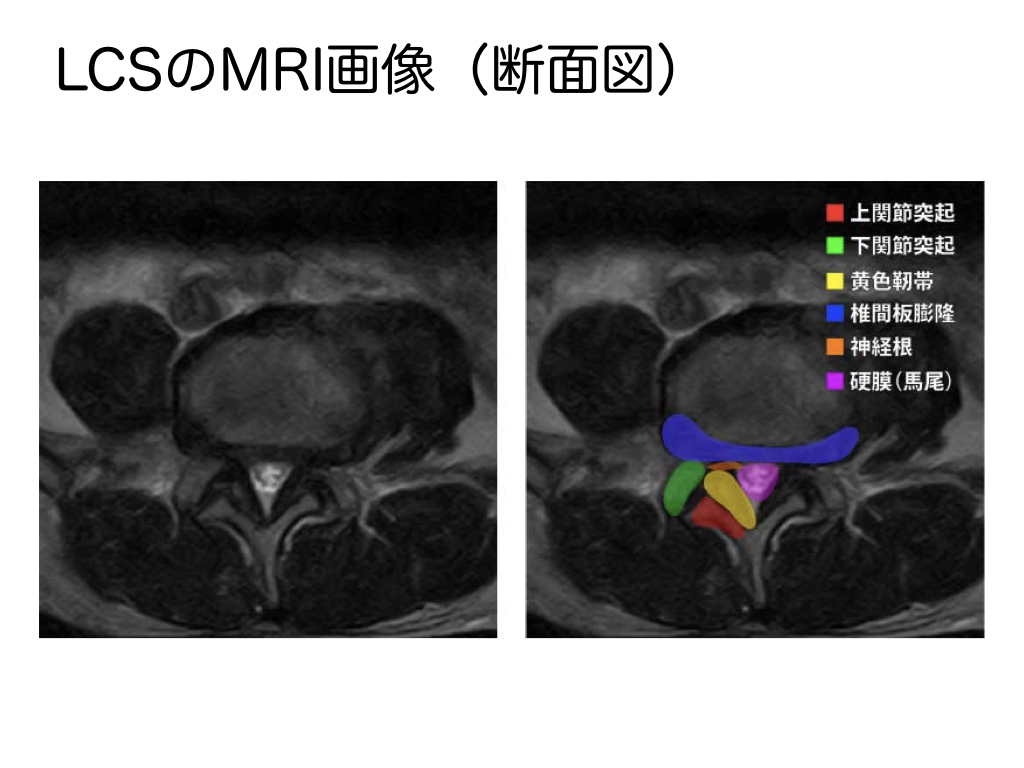 上は典型的なLCSのMRI画像ですが、このケースでは椎間板膨隆や黄色靭帯の肥厚が狭窄に関与しています。