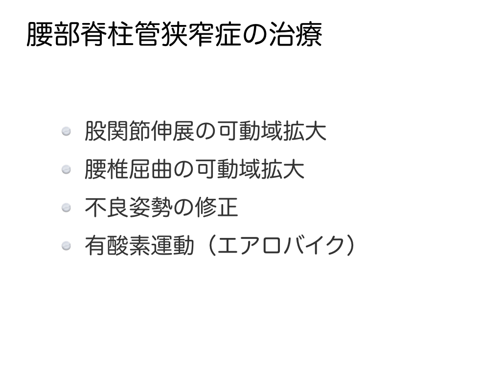 なにが原因で脊柱管が狭窄しているかでリハビリの内容も変わりますが、基本的には組織変性にて起こっているため、リハビリでの改善は期待できない場合が多いです。